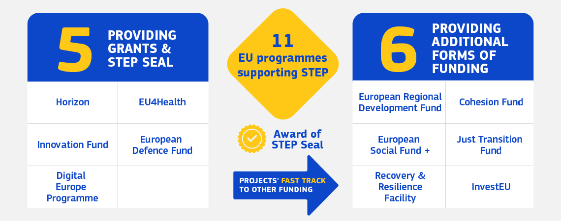 When applying to these programs, projects that contribute to strengthening Europe's technological autonomy, supporting the green and digital transitions, and addressing strategic dependencies may be awarded the STEP Seal. Projects being awarded a seal will be promoted on the STEP Portal. This will provide them with additional visibility towards investors and may help attract public and private funding by certifying their quality and contribution to the STEP objectives.