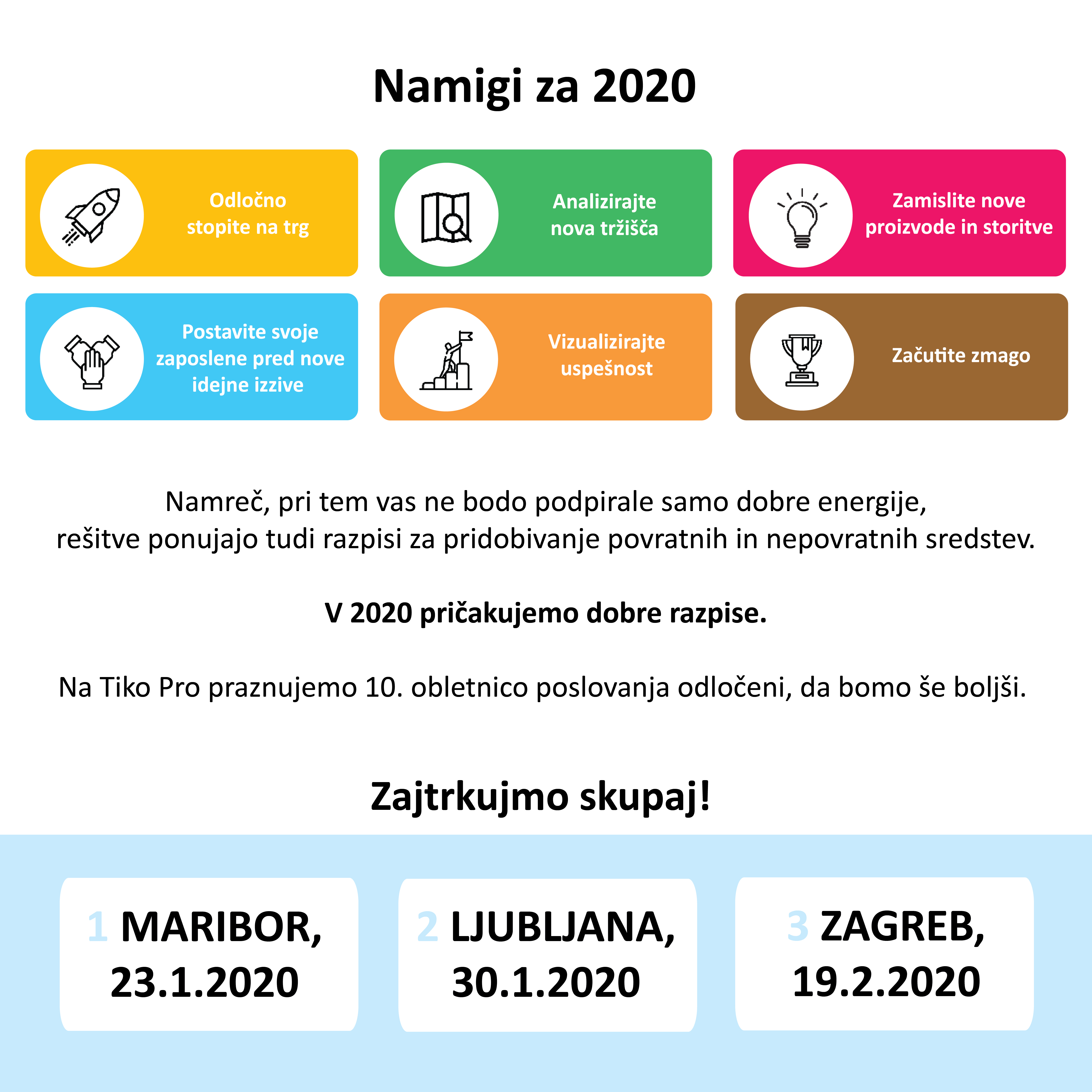 Podjetniški zajtrk v januarju: sredstva v 2020 Pohitite s prijavo na Podjetniški zajtrk, ki bo januarja v Mariboru in v Ljubljani, kjer boste izvedeli vse o možnostih pridobitve sredstev v Sloveniji, v Bruslju in na Hrvaškem. Vabljeni, da potrdite udeležbo! Date: 8. 01. 2020 Spoštovane podjetnice in podjetniki! Pohitite s prijavo na naš tradicionalni Podjetniški zajtrk, kjer boste izvedeli vse o možnostih pridobitve povratnih in nepovratnih sredstev v Sloveniji, v Bruslju in na Hrvaškem. Vabljeni, da potrdite udeležbo! 23.1.2020 ob 8:00 v Mariboru, Hotel City Maribor 30.1.2020 ob 8:00 v Ljubljani, Radisson Blu Plaza Hotel Ljubljana Pohitite s prijavo – število mest je omejeno. PRIJAVA TUKAJ Ob strokovnjakih s področja pridobivanja sredstev nam bo letos svoje izjemne izkušnje v zvezi z digitalno transformacijo in digitalno ekonomijo predal tudi Aleš Štempihar, digitalni strateg, skrbnik priprave digitalnih programov, priporočeni strokovnjak v DIH, direktor podjetja Askit, predsednik IIBA Slovenija in team leader pri Digital42. Predstavil bo konkretne primere v zvezi s prijavo na slovenski razpis Digitalna transformacija. Increase your chances - contact us. Do you need help with EU funding? Contact us Previous Do 200.000 eur za energetsko obnovo gostilne ali turistične nastanitve Next Letos na voljo več kot 137 mio eur nepovratnih sredstev - Kje jih iskati? All news