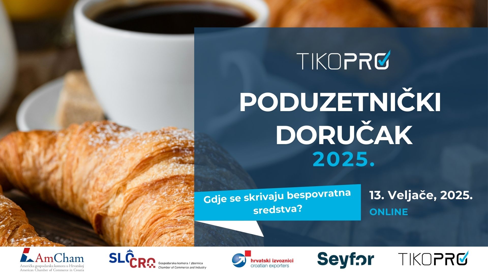 Tiko Pro Poduzetnički doručak: Gdje se skrivaju bespovratna sredstva u 2025. godini? S velikom radošću najavljujemo naš tradicionalni online Poduzetnički doručak koji svake godine privlači sve više sudionika. Zato vas i ove godine pozivamo na besplatni online događaj u 2025. godini! Date: 8. 01. 2025 Tiko Pro Poduzetnički doručak: Gdje se skrivaju bespovratna sredstva u 2025. godini? 📅 Datum: 13. veljače 2025. ⏰ Vrijeme: 09:30 📍 Lokacija: Online (ZOOM) Prijavite se S velikom radošću najavljujemo naš tradicionalni online Poduzetnički doručak koji svake godine privlači sve više sudionika. Zato vas i ove godine pozivamo na besplatni online događaj u 2025. godini! Što možete očekivati? Pregled aktualnih i najavljenih natječaja u Hrvatskoj Puno korisnih informacija i zanimljivih tema koje smo pripremili samo za vas PROGRAM Ako je suditi po dosadašnjem interesu, mjesta će se brzo popuniti, zato ne čekajte – prijavite se već danas i osigurajte svoje mjesto! Radujemo se vašem prisustvu! 😊 Increase your chances - contact us. Do you need help with EU funding? Contact us Previous TOP prilike za EU financiranje (besplatna brošura) Next Izgradnja i opremanje postrojenja za obradu reciklabilnog otpada All news